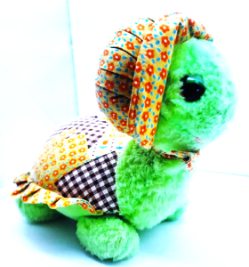Her soft green plush, her patchwork shell with ruffles,