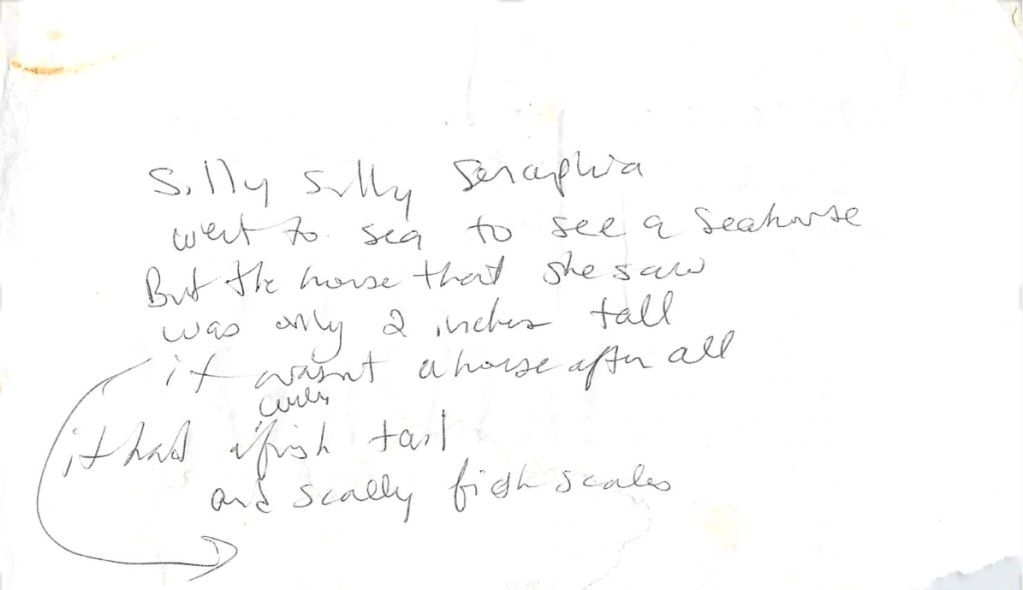 Silly Silly Seraphia went to sea to see a seahorse
