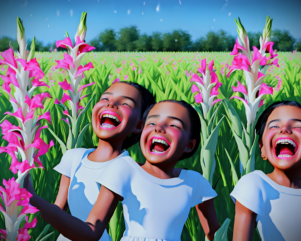 This poem captures a cheerful and playful atmosphere that is often associated with spring. The image of sisters laughing and playing together evokes a sense of joy and togetherness. The reference to “Ring around the roses” adds a nostalgic touch and reminds us of childhood memories. The mention of Gladiolus growing in the field is a lovely detail that evokes the beauty and renewal of nature, Gladiolus, however, blooms in July and August. Glory-of-the-snow grows in the spring. To make it indicative of spring you would want to change the flower.