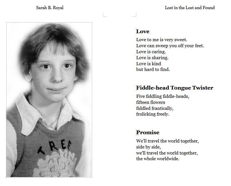 Sarah B. Royal continues to expand the possibilities of poetic form, offering readers a deeply personal yet universally resonant experience. Her writing is a testament to the power of creative risk, intellectual depth, and emotional authenticity.