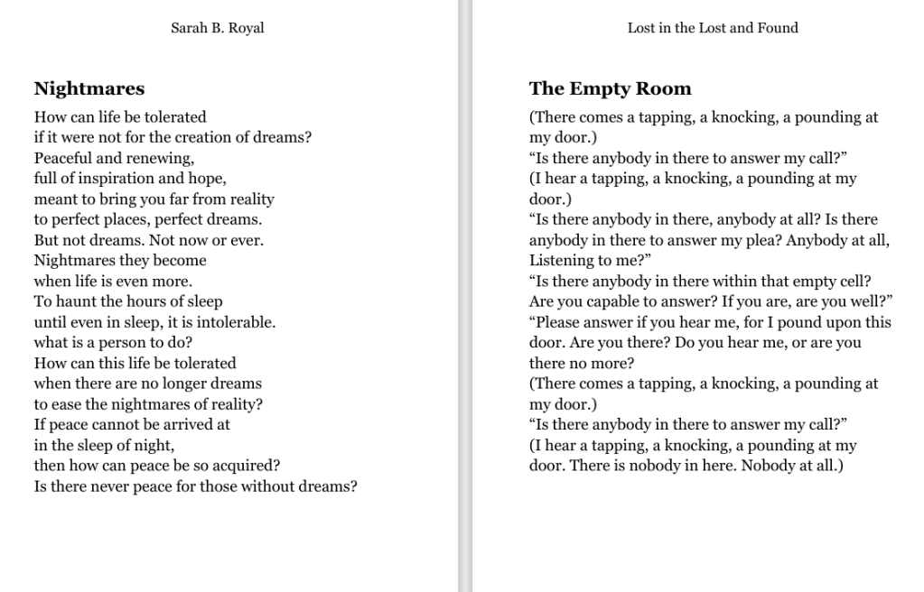 Sarah B. Royal continues to expand the possibilities of poetic form, offering readers a deeply personal yet universally resonant experience. Her writing is a testament to the power of creative risk, intellectual depth, and emotional authenticity.