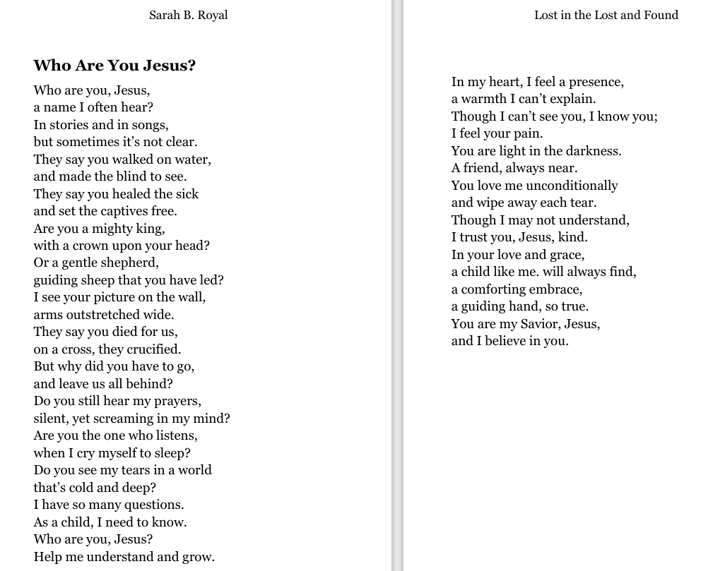 Sarah B. Royal continues to expand the possibilities of poetic form, offering readers a deeply personal yet universally resonant experience. Her writing is a testament to the power of creative risk, intellectual depth, and emotional authenticity.