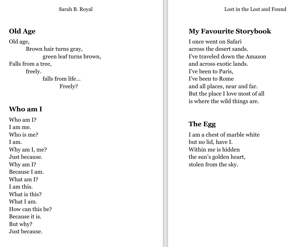 Sarah B. Royal continues to expand the possibilities of poetic form, offering readers a deeply personal yet universally resonant experience. Her writing is a testament to the power of creative risk, intellectual depth, and emotional authenticity.