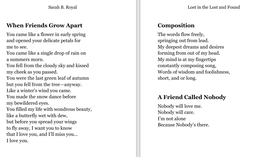 Sarah B. Royal continues to expand the possibilities of poetic form, offering readers a deeply personal yet universally resonant experience. Her writing is a testament to the power of creative risk, intellectual depth, and emotional authenticity.
