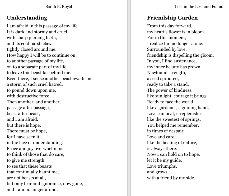 Sarah B. Royal continues to expand the possibilities of poetic form, offering readers a deeply personal yet universally resonant experience. Her writing is a testament to the power of creative risk, intellectual depth, and emotional authenticity.