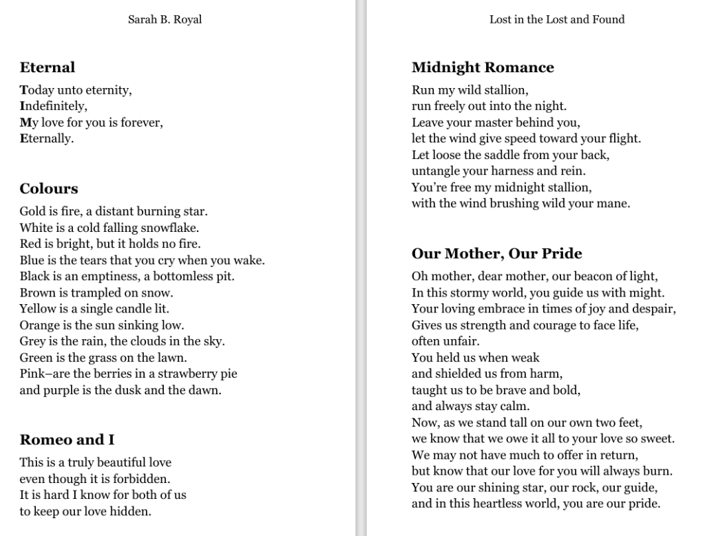 Sarah B. Royal continues to expand the possibilities of poetic form, offering readers a deeply personal yet universally resonant experience. Her writing is a testament to the power of creative risk, intellectual depth, and emotional authenticity.