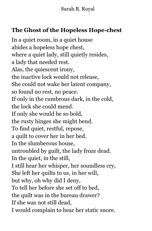 Sarah B. Royal continues to expand the possibilities of poetic form, offering readers a deeply personal yet universally resonant experience. Her writing is a testament to the power of creative risk, intellectual depth, and emotional authenticity.