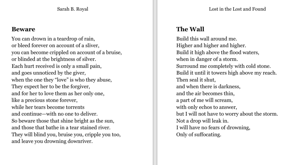 Sarah B. Royal continues to expand the possibilities of poetic form, offering readers a deeply personal yet universally resonant experience. Her writing is a testament to the power of creative risk, intellectual depth, and emotional authenticity.