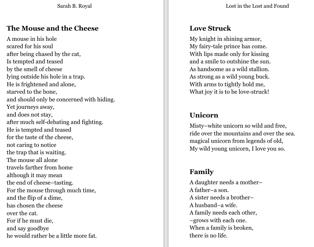 Sarah B. Royal continues to expand the possibilities of poetic form, offering readers a deeply personal yet universally resonant experience. Her writing is a testament to the power of creative risk, intellectual depth, and emotional authenticity.