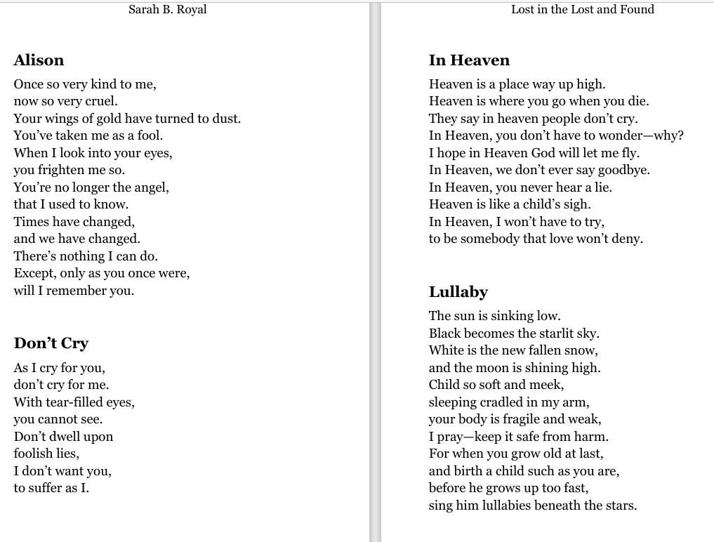 Sarah B. Royal continues to expand the possibilities of poetic form, offering readers a deeply personal yet universally resonant experience. Her writing is a testament to the power of creative risk, intellectual depth, and emotional authenticity.