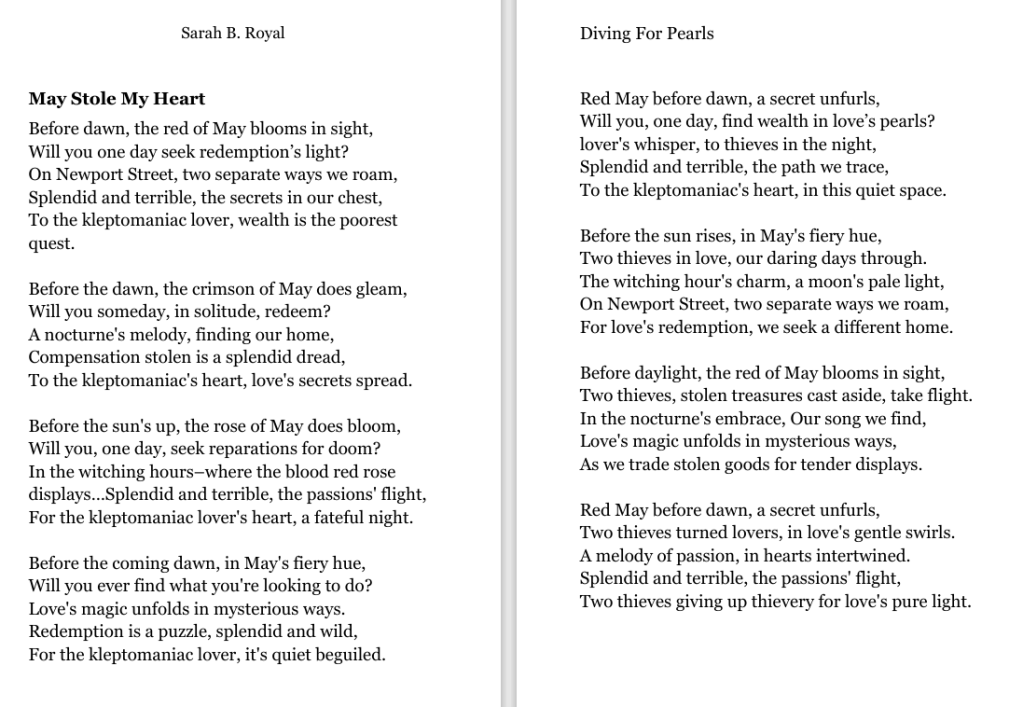 Sarah B. Royal continues to expand the possibilities of poetic form, offering readers a deeply personal yet universally resonant experience. Her writing is a testament to the power of creative risk, intellectual depth, and emotional authenticity.