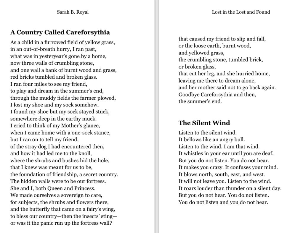 Sarah B. Royal continues to expand the possibilities of poetic form, offering readers a deeply personal yet universally resonant experience. Her writing is a testament to the power of creative risk, intellectual depth, and emotional authenticity.
