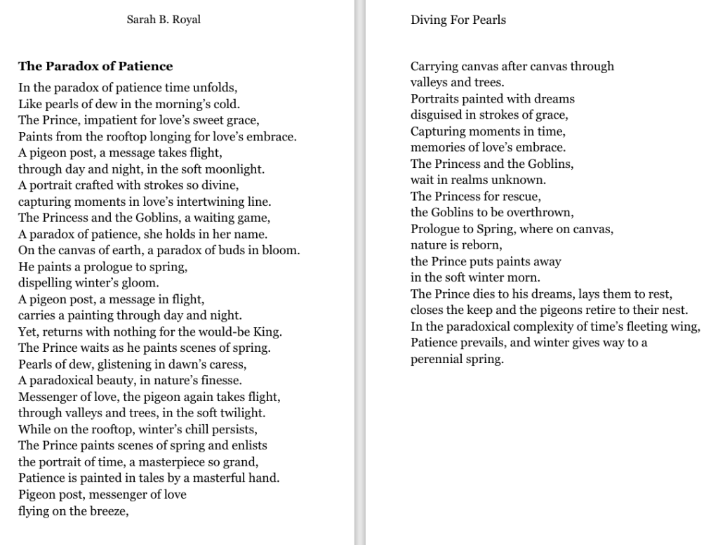 Sarah B. Royal continues to expand the possibilities of poetic form, offering readers a deeply personal yet universally resonant experience. Her writing is a testament to the power of creative risk, intellectual depth, and emotional authenticity.