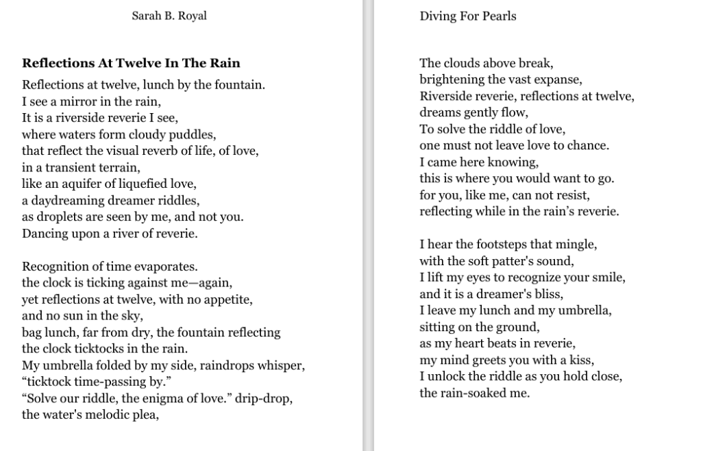 Sarah B. Royal continues to expand the possibilities of poetic form, offering readers a deeply personal yet universally resonant experience. Her writing is a testament to the power of creative risk, intellectual depth, and emotional authenticity.