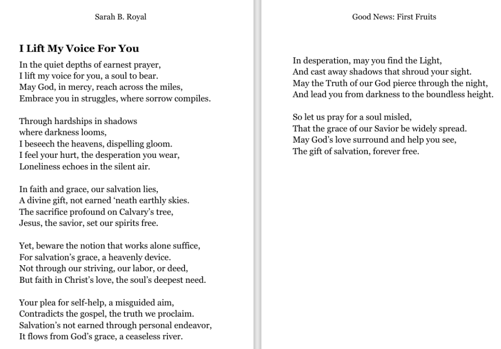 Sarah B. Royal continues to expand the possibilities of poetic form, offering readers a deeply personal yet universally resonant experience. Her writing is a testament to the power of creative risk, intellectual depth, and emotional authenticity.