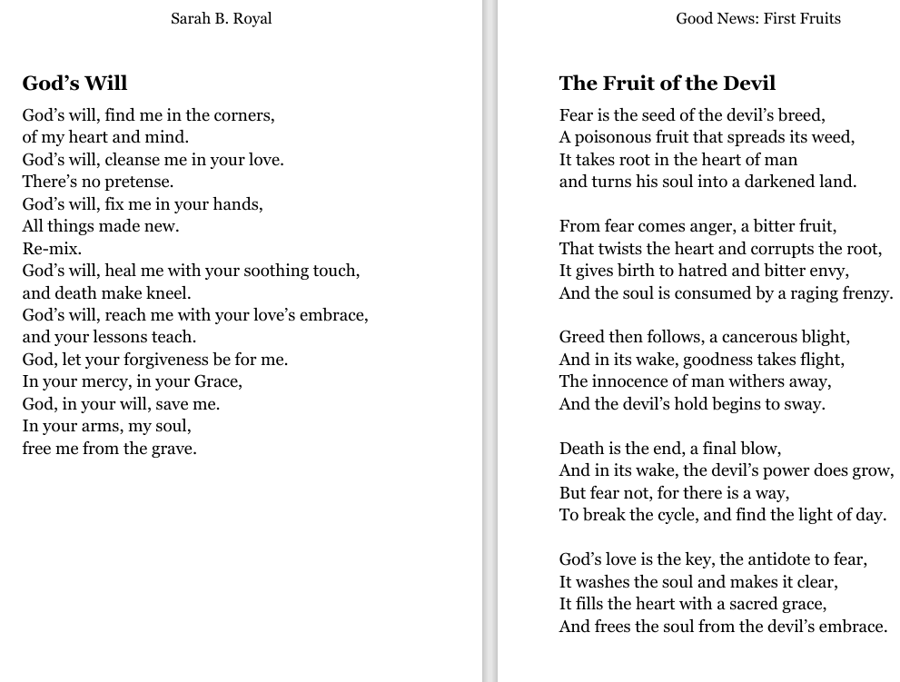 Sarah B. Royal continues to expand the possibilities of poetic form, offering readers a deeply personal yet universally resonant experience. Her writing is a testament to the power of creative risk, intellectual depth, and emotional authenticity.