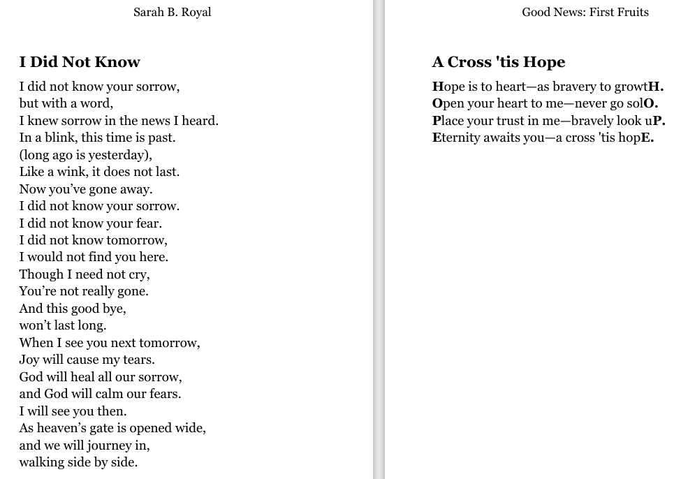 Sarah B. Royal continues to expand the possibilities of poetic form, offering readers a deeply personal yet universally resonant experience. Her writing is a testament to the power of creative risk, intellectual depth, and emotional authenticity.