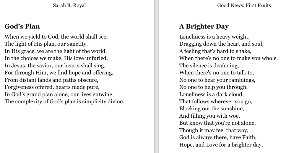 Sarah B. Royal continues to expand the possibilities of poetic form, offering readers a deeply personal yet universally resonant experience. Her writing is a testament to the power of creative risk, intellectual depth, and emotional authenticity.