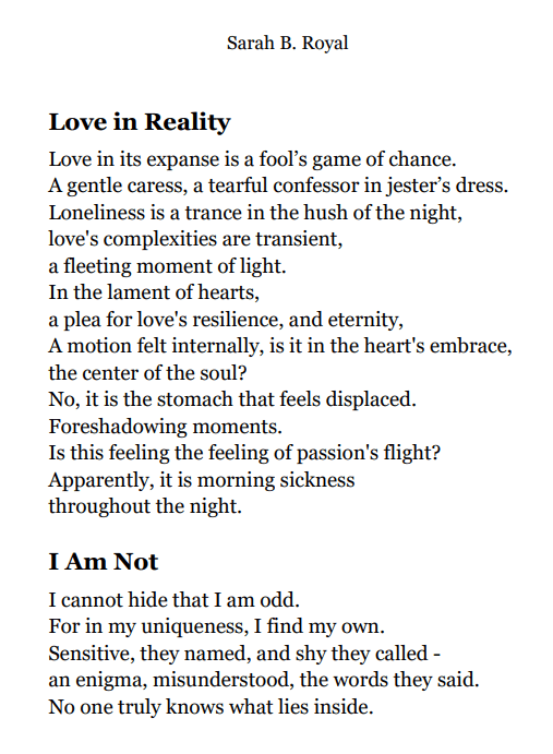 Sarah B. Royal continues to expand the possibilities of poetic form, offering readers a deeply personal yet universally resonant experience. Her writing is a testament to the power of creative risk, intellectual depth, and emotional authenticity.