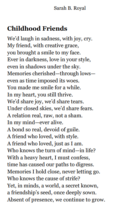 Sarah B. Royal continues to expand the possibilities of poetic form, offering readers a deeply personal yet universally resonant experience. Her writing is a testament to the power of creative risk, intellectual depth, and emotional authenticity.