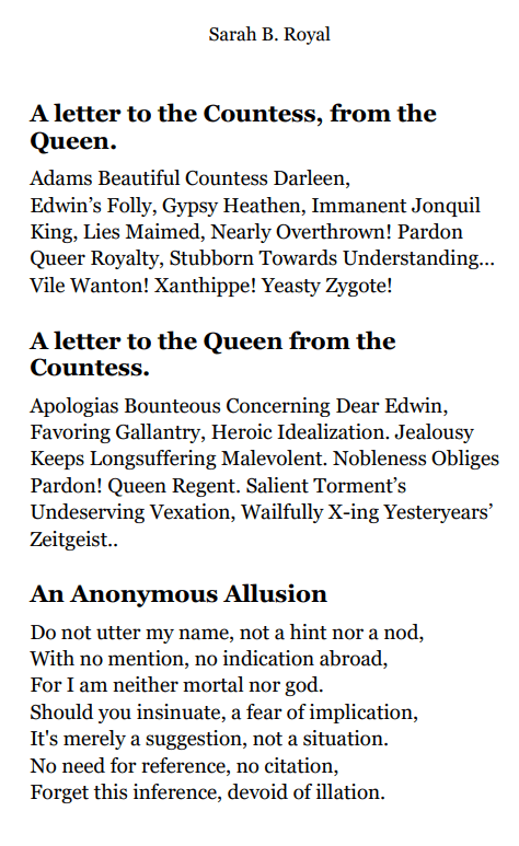 Sarah B. Royal continues to expand the possibilities of poetic form, offering readers a deeply personal yet universally resonant experience. Her writing is a testament to the power of creative risk, intellectual depth, and emotional authenticity.