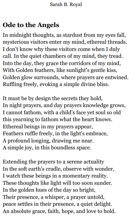 Sarah B. Royal continues to expand the possibilities of poetic form, offering readers a deeply personal yet universally resonant experience. Her writing is a testament to the power of creative risk, intellectual depth, and emotional authenticity.