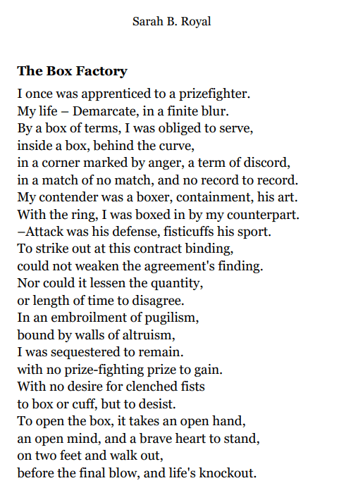 Sarah B. Royal continues to expand the possibilities of poetic form, offering readers a deeply personal yet universally resonant experience. Her writing is a testament to the power of creative risk, intellectual depth, and emotional authenticity.