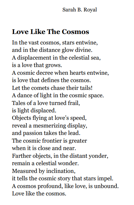 Sarah B. Royal continues to expand the possibilities of poetic form, offering readers a deeply personal yet universally resonant experience. Her writing is a testament to the power of creative risk, intellectual depth, and emotional authenticity.