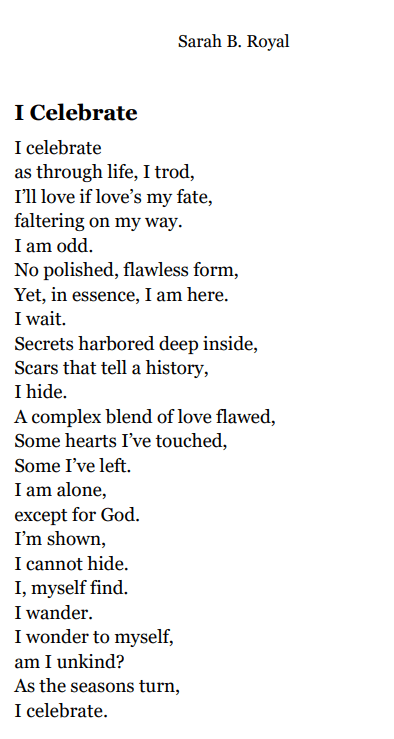 Sarah B. Royal continues to expand the possibilities of poetic form, offering readers a deeply personal yet universally resonant experience. Her writing is a testament to the power of creative risk, intellectual depth, and emotional authenticity.