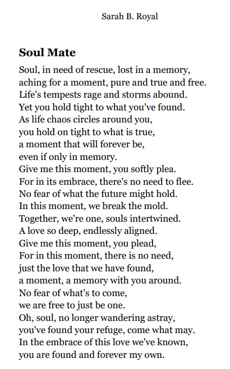 Sarah B. Royal continues to expand the possibilities of poetic form, offering readers a deeply personal yet universally resonant experience. Her writing is a testament to the power of creative risk, intellectual depth, and emotional authenticity.