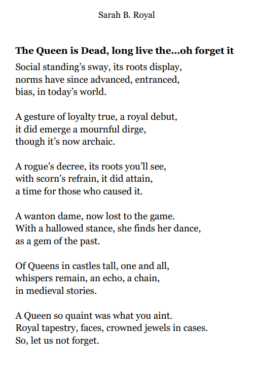 Sarah B. Royal continues to expand the possibilities of poetic form, offering readers a deeply personal yet universally resonant experience. Her writing is a testament to the power of creative risk, intellectual depth, and emotional authenticity.