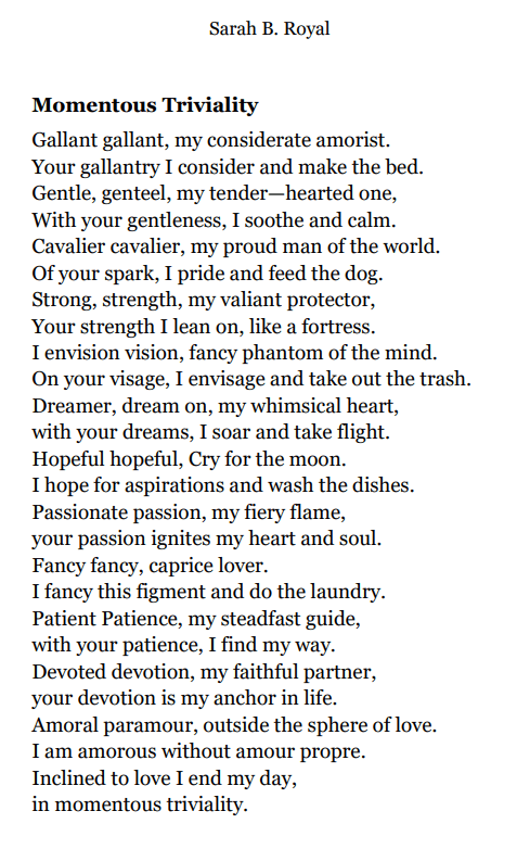 Sarah B. Royal continues to expand the possibilities of poetic form, offering readers a deeply personal yet universally resonant experience. Her writing is a testament to the power of creative risk, intellectual depth, and emotional authenticity.