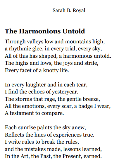 Sarah B. Royal continues to expand the possibilities of poetic form, offering readers a deeply personal yet universally resonant experience. Her writing is a testament to the power of creative risk, intellectual depth, and emotional authenticity.