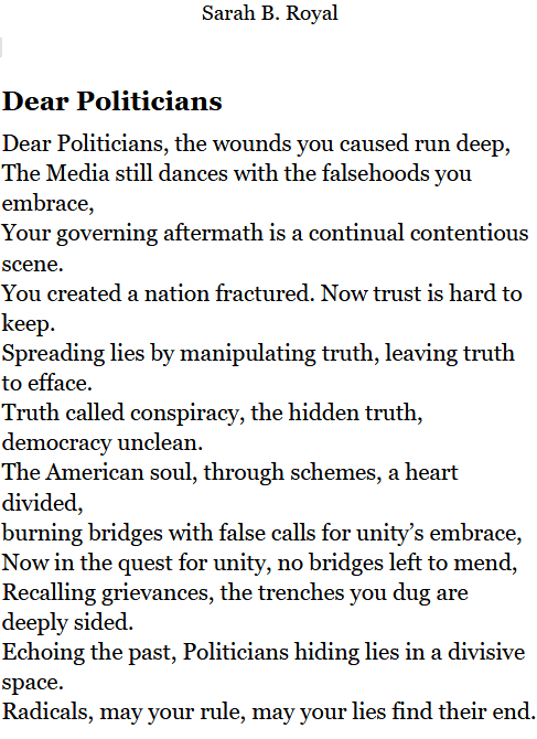 Sarah B. Royal continues to expand the possibilities of poetic form, offering readers a deeply personal yet universally resonant experience. Her writing is a testament to the power of creative risk, intellectual depth, and emotional authenticity.