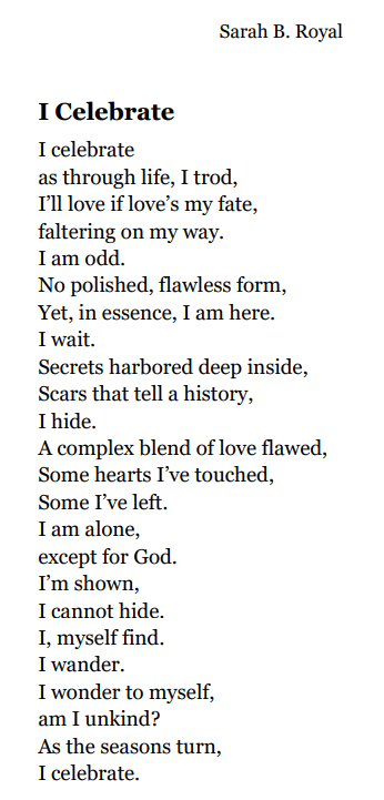 Sarah B. Royal continues to expand the possibilities of poetic form, offering readers a deeply personal yet universally resonant experience. Her writing is a testament to the power of creative risk, intellectual depth, and emotional authenticity.