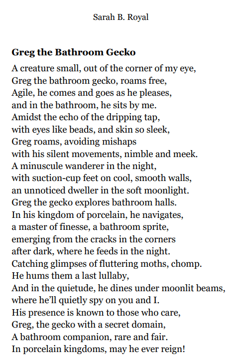 Sarah B. Royal continues to expand the possibilities of poetic form, offering readers a deeply personal yet universally resonant experience. Her writing is a testament to the power of creative risk, intellectual depth, and emotional authenticity.