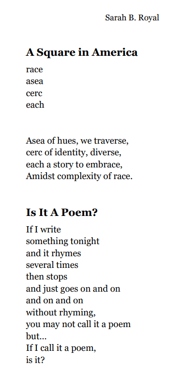 Sarah B. Royal continues to expand the possibilities of poetic form, offering readers a deeply personal yet universally resonant experience. Her writing is a testament to the power of creative risk, intellectual depth, and emotional authenticity.