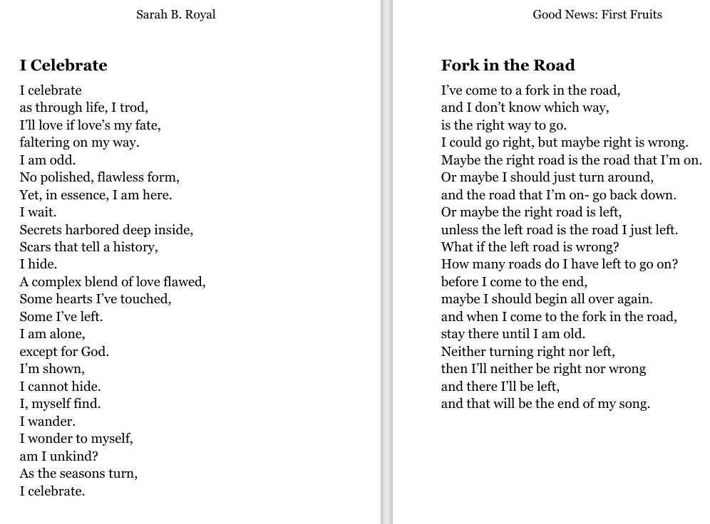 Sarah B. Royal continues to expand the possibilities of poetic form, offering readers a deeply personal yet universally resonant experience. Her writing is a testament to the power of creative risk, intellectual depth, and emotional authenticity.