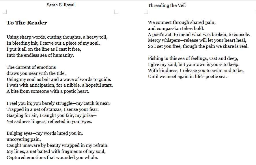 Sarah B. Royal continues to expand the possibilities of poetic form, offering readers a deeply personal yet universally resonant experience. Her writing is a testament to the power of creative risk, intellectual depth, and emotional authenticity.