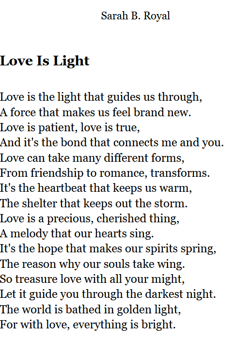 Sarah B. Royal continues to expand the possibilities of poetic form, offering readers a deeply personal yet universally resonant experience. Her writing is a testament to the power of creative risk, intellectual depth, and emotional authenticity.