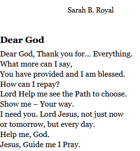 Sarah B. Royal continues to expand the possibilities of poetic form, offering readers a deeply personal yet universally resonant experience. Her writing is a testament to the power of creative risk, intellectual depth, and emotional authenticity.