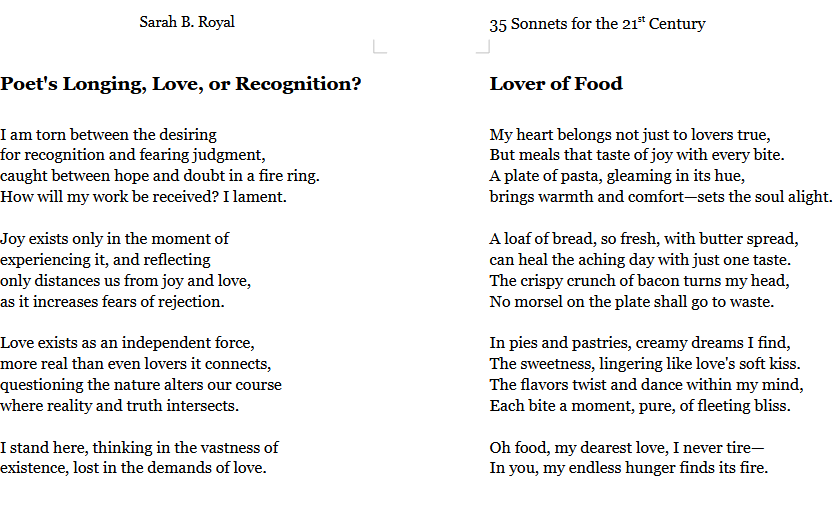 Sarah B. Royal continues to expand the possibilities of poetic form, offering readers a deeply personal yet universally resonant experience. Her writing is a testament to the power of creative risk, intellectual depth, and emotional authenticity.