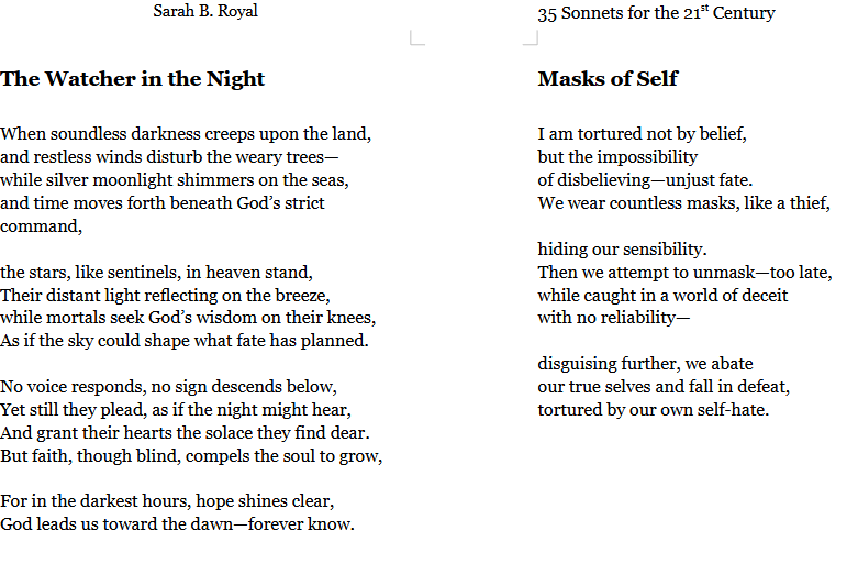 Sarah B. Royal continues to expand the possibilities of poetic form, offering readers a deeply personal yet universally resonant experience. Her writing is a testament to the power of creative risk, intellectual depth, and emotional authenticity.