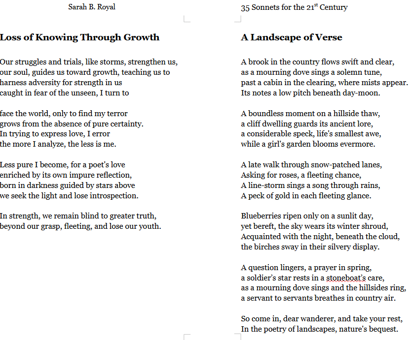 Sarah B. Royal continues to expand the possibilities of poetic form, offering readers a deeply personal yet universally resonant experience. Her writing is a testament to the power of creative risk, intellectual depth, and emotional authenticity.