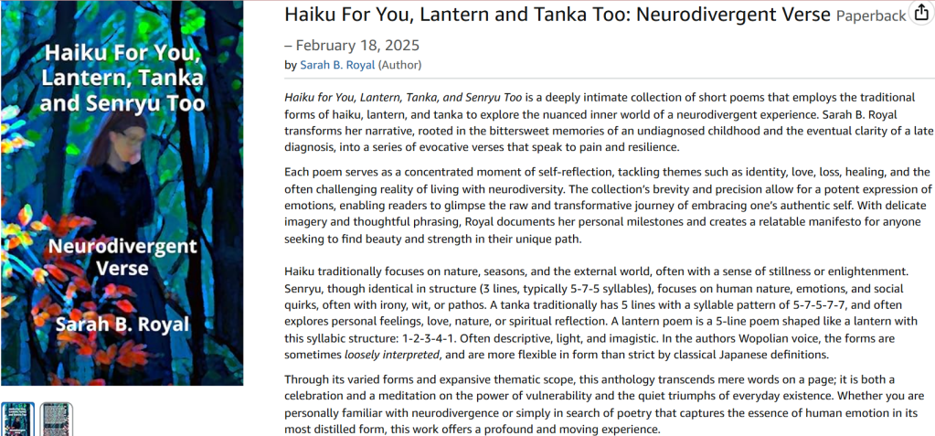 Royal’s collections—such as Lost in the Lost and Found, Haiku For You, Lantern and Tanka Too, and the WoPoLi Chapbook Series—highlight her commitment to neurodivergent expression and poetic experimentation. Whether through childhood verse or contemporary fusion poetry, her work invites readers into a world where language is both a tool and a playground.