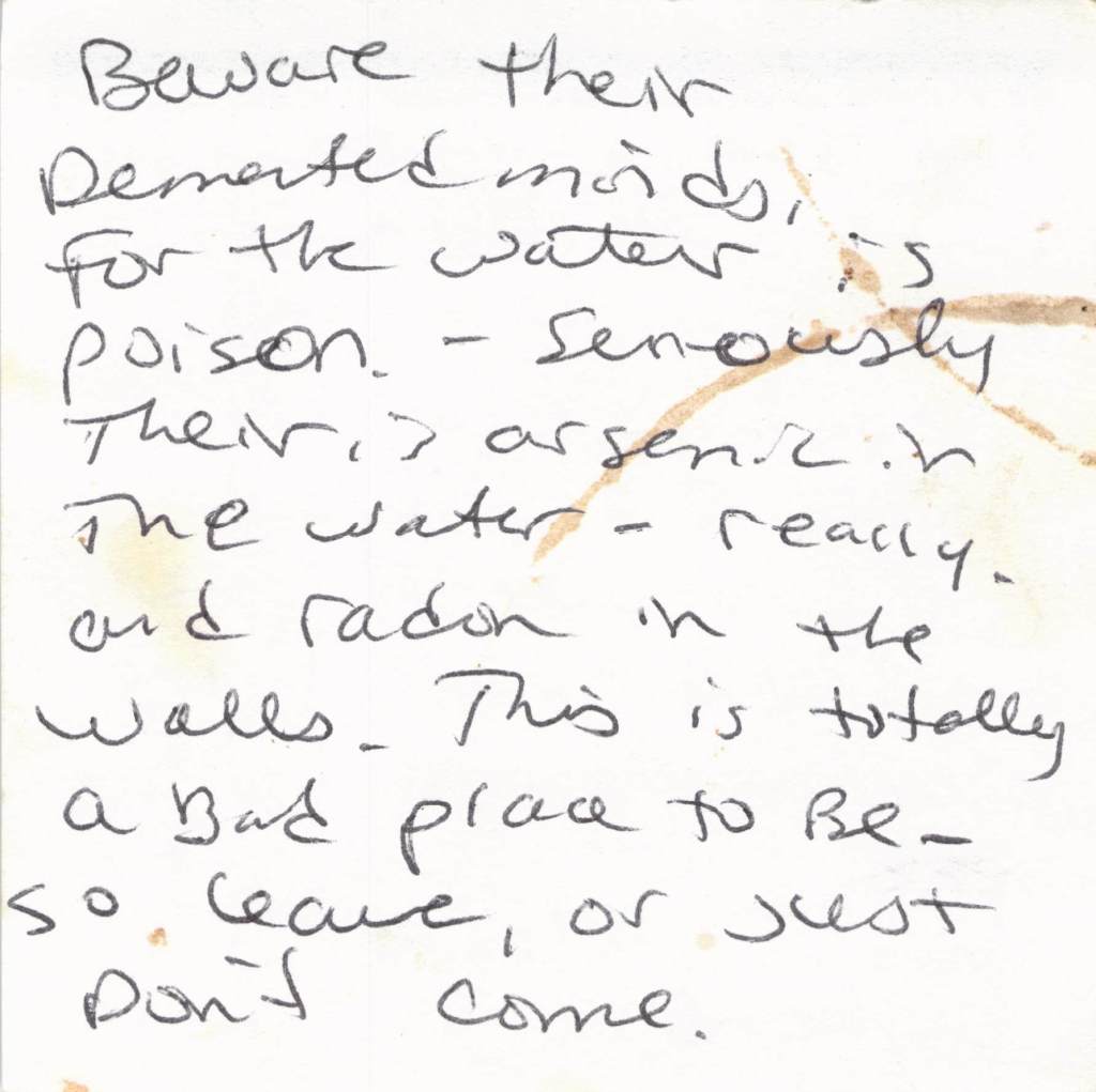 There is something in the water here. Some say it’s tasty. Beware their demented minds, for the water is poison—seriously, there is arsenic in the water—really—and radon in the walls.