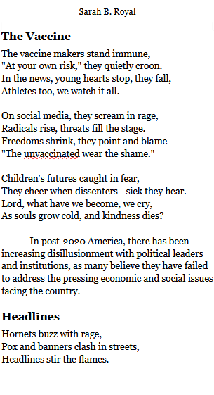 Sarah B. Royal continues to expand the possibilities of poetic form, offering readers a deeply personal yet universally resonant experience. Her writing is a testament to the power of creative risk, intellectual depth, and emotional authenticity.
