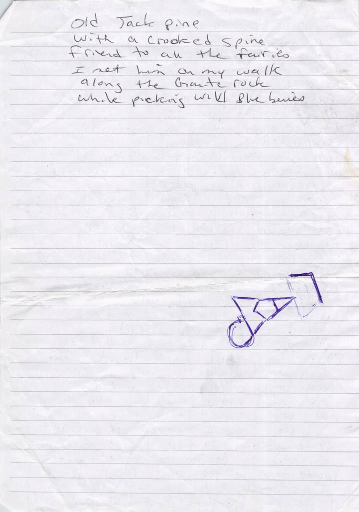 In the middle of the night, with all the lights out, this verse jumped in my head as I was remembering my walk on the ledges behind Davis Lane on mount desert island years before. The jack pine trees were 10 to 15 feet tall at the time on the granite ledges that was also covered in blue berry bushes. I imaged a magical scene of unicorns running behind them. I had to get out of bed and grab a piece of paper to write it down. If I hadn’t the poem would not have evolved.