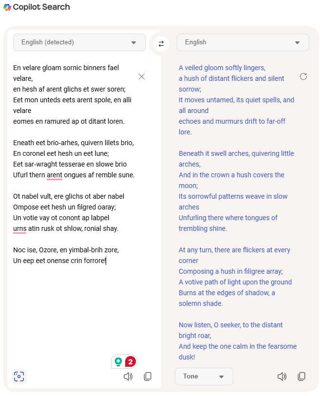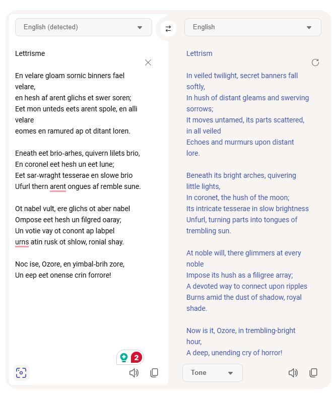 Once my Lettrisme poem was complete, a thought occurred to me. Because I had shaped the poem to resemble a conventional sonnet—mimicking the appearance of a foreign language (not required in Lettrisme, but permitted)—while ensuring it remained nonsensical, I wondered whether Google Translate might mistake it for a real language.