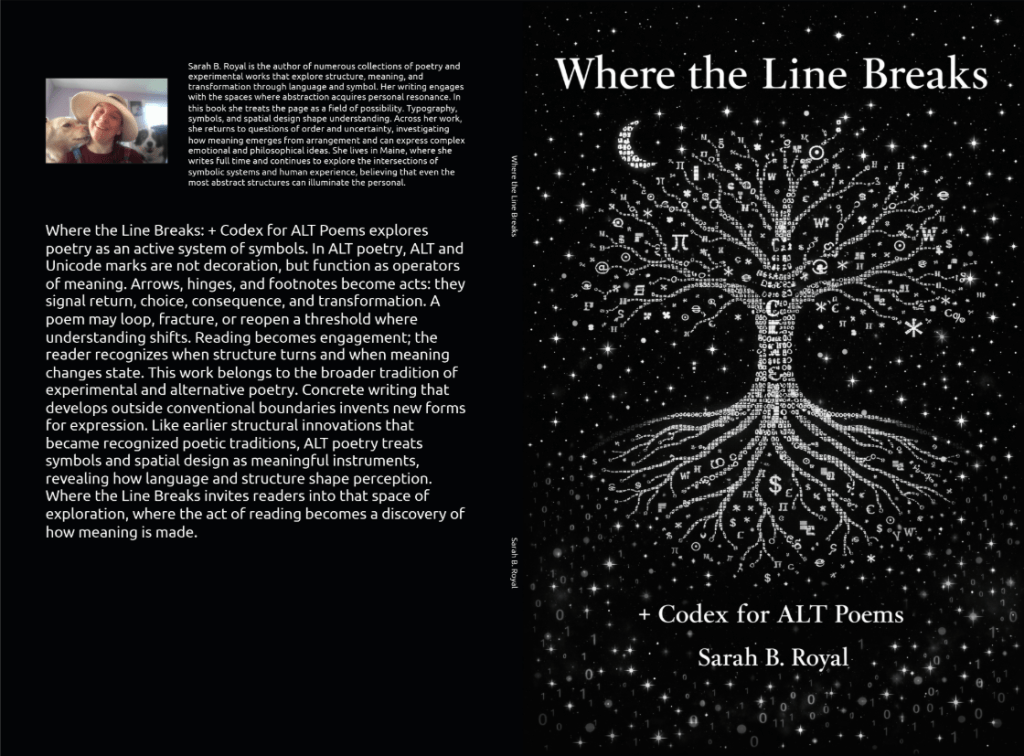 Where the Line Breaks: + Codex for ALT Poems is a groundbreaking collection that reimagines poetry through symbolic logic, visual structure, and semantic innovation. Blending concrete layout with a personal ALT/Unicode codex, this work transforms the page into a compositional field where symbols act as operators—carrying meaning through spatial arrangement, recursion, and visual rhythm rather than conventional narrative. Poetic fragments collapse into glyphic patterns; operator sequences such as arrows, cycles, and logical markers become the engine of semantic transformation; and the interplay between language and expressive symbols invites readers into a new lexicon of poetics grounded in both medieval scribal tradition and contemporary typographic experimentation. Where the Line Breaks challenges assumptions about how language works and offers a richly layered experience for readers interested in the edge where structure and meaning intersect.